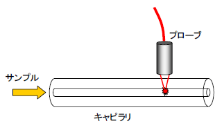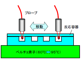 DNA増幅時の蛍光発光量変化を簡単にオンラインで検出できます。またプローブを移動しながら測定する事で多項目・多検体の測定装置が設計できます。