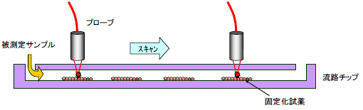 ウエル・マイクロ流路・硝子プレート等に固定化した試薬と反応させ、蛍光検出する事により簡単に微量サンプルでの免疫検査ができます。またスキャンする事により多項目の検査装置も簡単にできます。